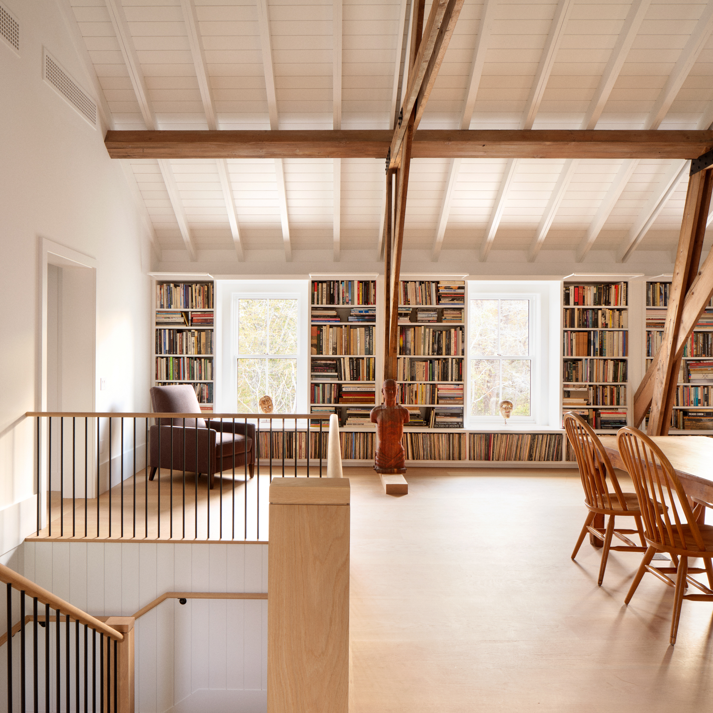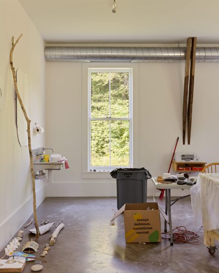 The renewal updates the 3,300-square-foot barn to fully serve the Foundation’s mission while retaining the creative spirit of its place. The attic space is fully habitable with a shared library space that houses many of Albee’s own books and records, and renovated sleeping quarters that offer each artist in residence a bedroom and private bathroom. Downstairs, an expanded communal kitchen faces out onto the wetlands, and a new elevator makes both levels accessible for all. A 1,400-square-foot cottage has also been rebuilt as a residence for the property’s caretaker.